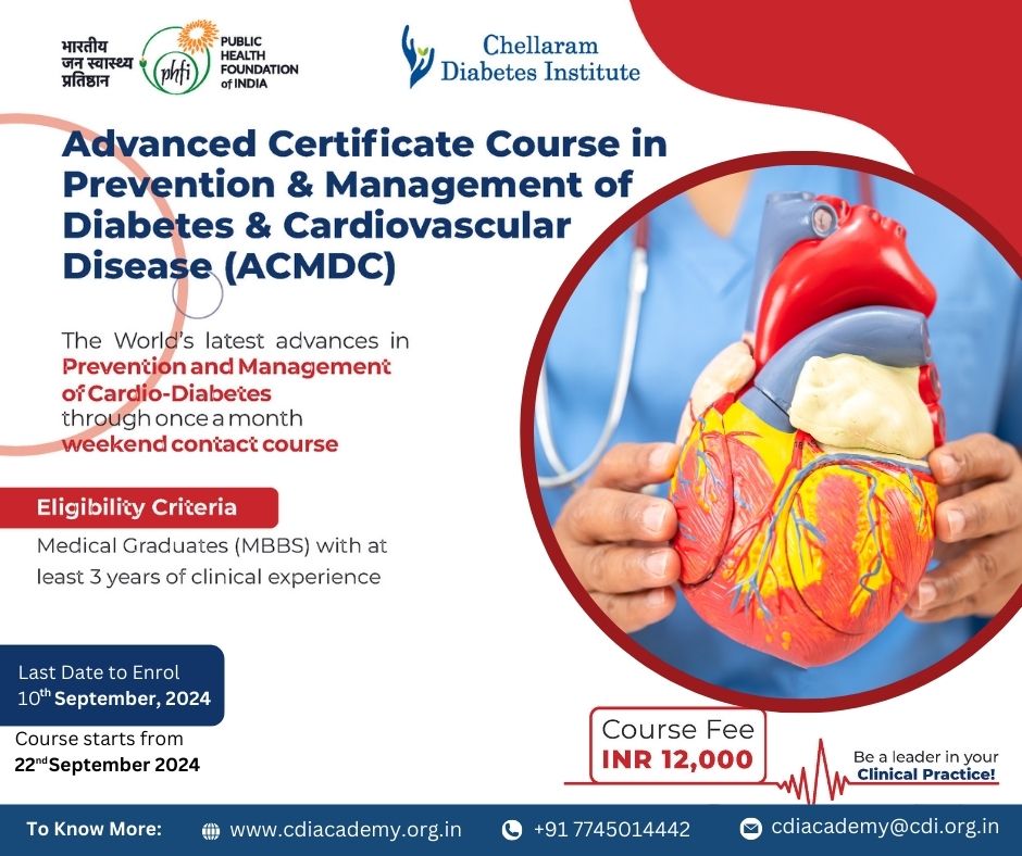 The Chellaram Diabetes Institute (CDI) is the National Academic Partner for the Curriculum Development of the Advanced Certificate Course in the Prevention and Management of Diabetes and Cardiovascular Disease (ACMDC), working in association with the Public Health Foundation of India (PHFI).