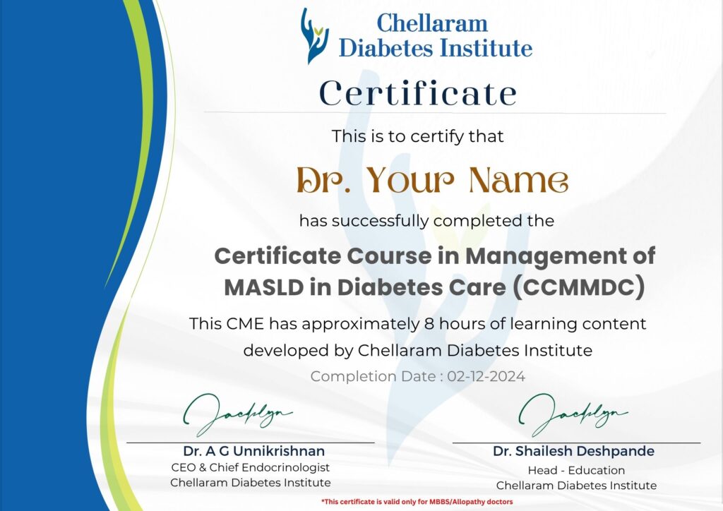 The Certificate Course in Management of MASLD in Diabetes Care (CCMMDC) provides in-depth knowledge of the underlying mechanisms of MASLD, its diagnostic approaches and its clinical spectrum. It will help develop practical skills to apply non-invasive tools for the early identification of at-risk patients. Evidence-based strategies for management, ranging from dietary and lifestyle interventions to pharmacological therapies, as well as surgical interventions in selected cases will be covered.